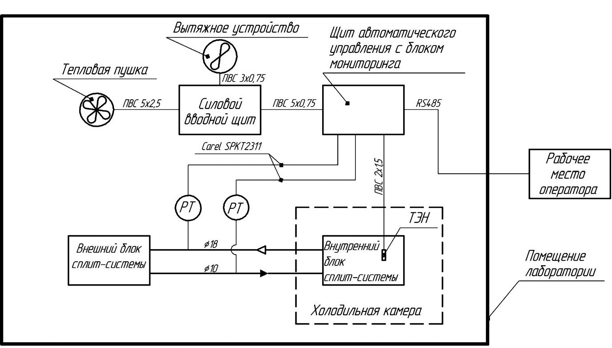 Для обеспечения микроклимата в лаборатории установлена тепловая пушка, а также вытяжное устройство (осевой вентилятор), которые соединены с вводным силовым щитом.