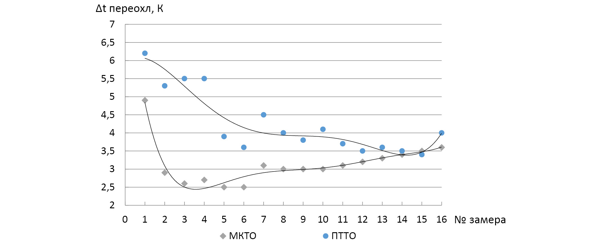 Рис. 3. Величина переохлаждения жидкого хладагента в МКТО и ПТТО.
