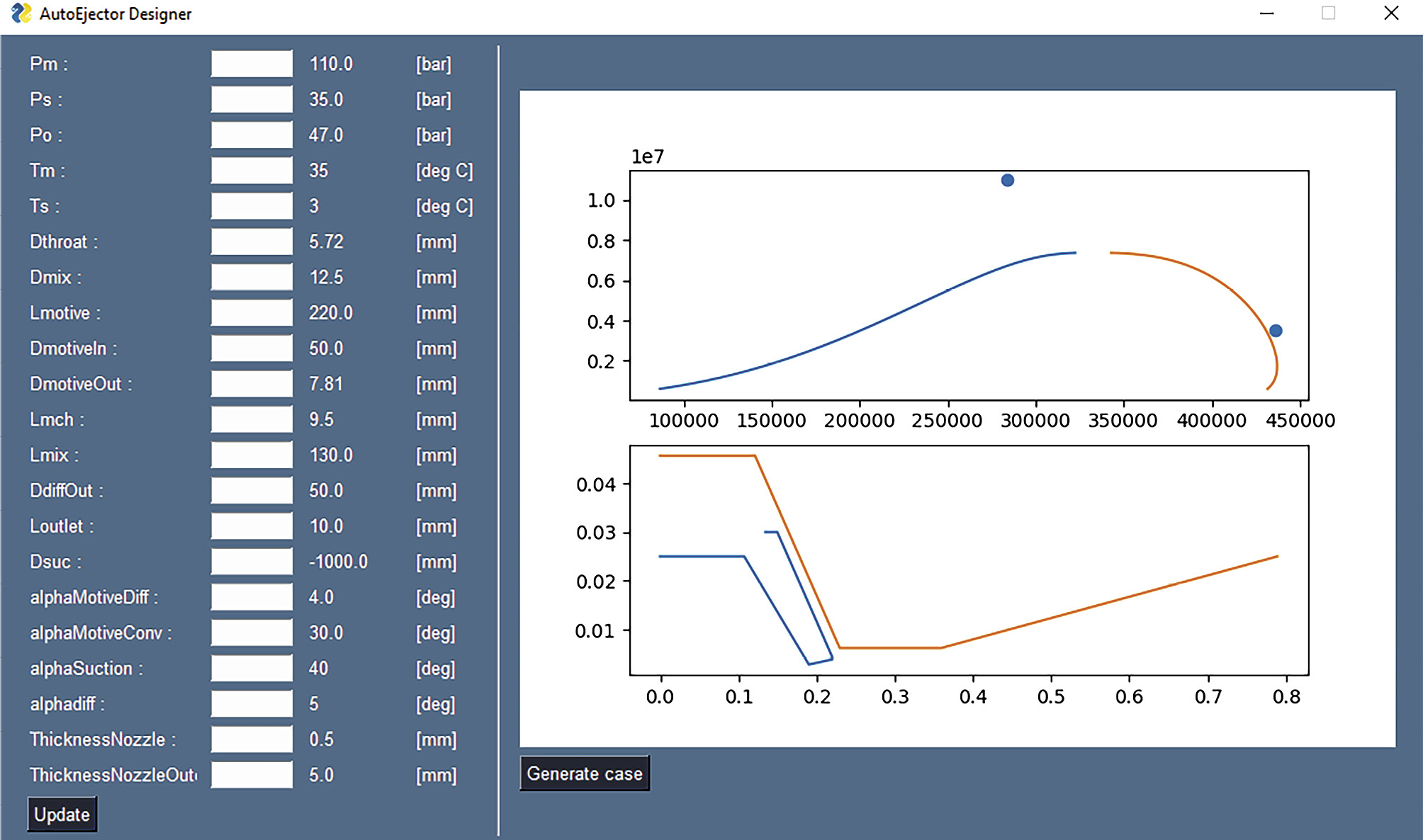 Для упрощения проектирования эжектора был реализован графический пользовательский интерфейс (GUI). Графический интерфейс даёт пользователю возможность выбрать начальные значения параметров и увидеть, как выбор влияет на конструкцию эжектора. Это позволяет лучше понимать и ускорять процесс проектирования эжектора.