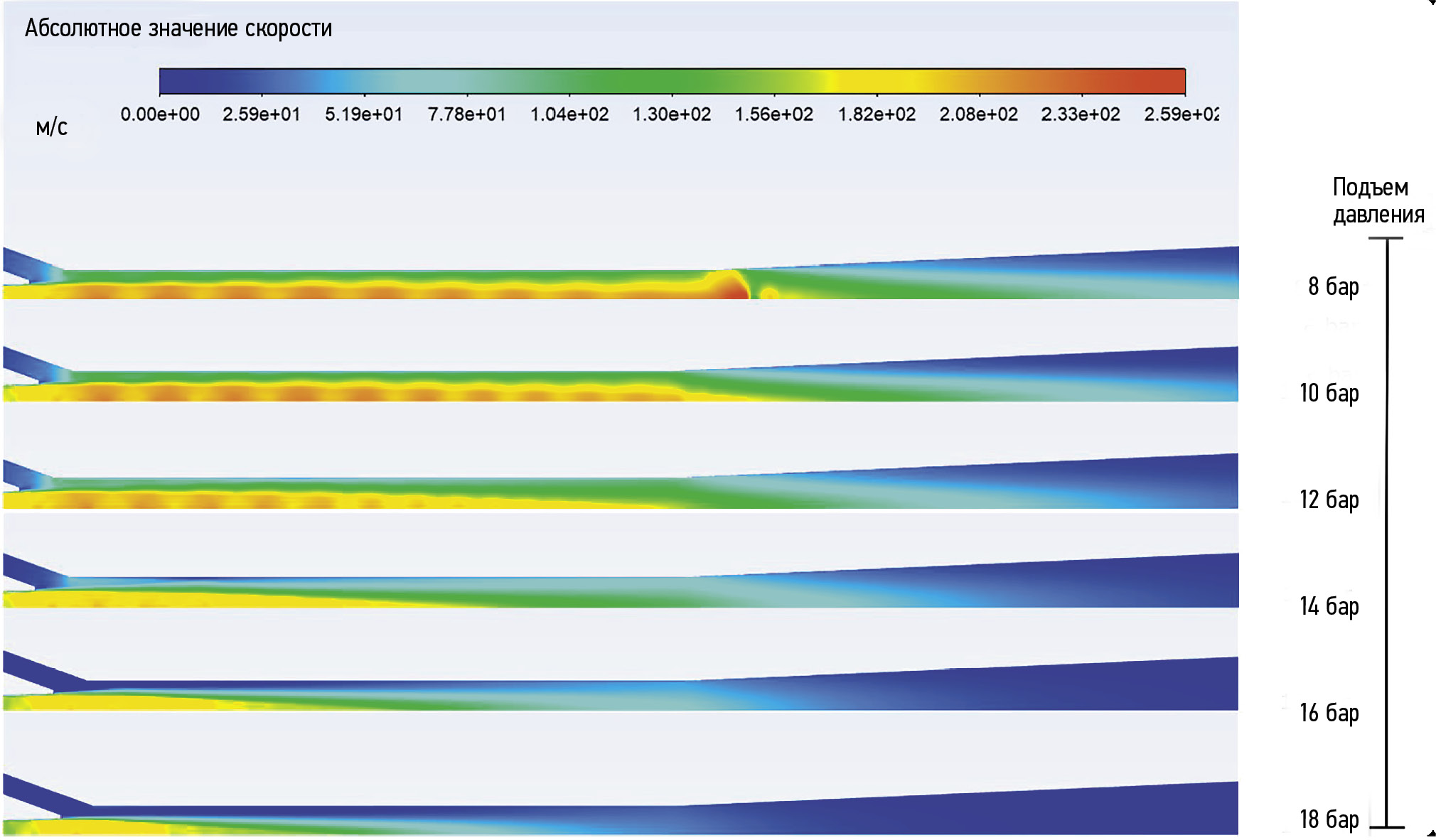 На рис. 3 показано распределение скорости в смесительной камере для различных значений подъема давления. Поток четко переходит от длинной ударной волны к короткому ядру с высокой скоростью течения по мере увеличения подъема давления. Здесь также показано, как эжектируемый поток переходит от сверхзвукового клинообразного потока к дозвуковому потоку для более высокого подъема давления.