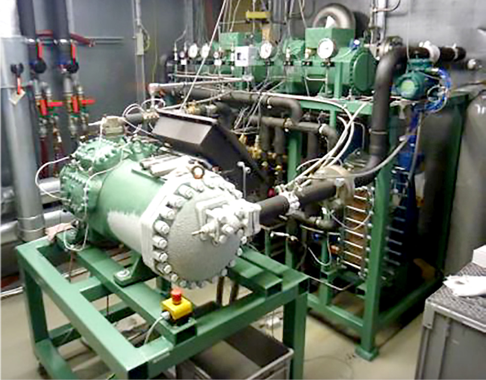 Компрессоры, в первую очередь, рассматриваются для применения на ступени СТ. Широкий диапазон применения охватывает температуру кипения от -20 до 15 °C и давление нагнетания от 40 до 110 бар. Модель с наибольшим описанным объемом из новой линейки получила обозначение 8CTE-140K (см. рис. 1). При рабочей частоте 50 Гц описанный объем составляет 99,2 м³/ч. электродвигатель представляет собой асинхронный электродвигатель новой конструкции с номинальной мощностью 140 л.с., в дальнейшем обозначаемый как асинхронный двигатель (ASM). Исходя из номинальных условий температуры кипения -10 °C, перегрева 10 К, давления нагнетания 90 бар и температуры газа на выходе из газоохладителя 35 °C, машина обеспечивает холодопроизводительность 223 кВт при потребляемой мощности 119 кВт. Приведенные значения основаны на измерениях с запорными клапанами всасывания и нагнетания, и процесс оптимизации еще не завершен. Даже с учетом этого, в сравнении с компрессором модели 6CTE-50K относительный прирост изоэнтропного КПД уже превышает 8 %. Компрессор имеет массу 726 кг, довольно компактен по своей конструкции и показан на рис. 1 на испытательном стенде в научно-исследовательском центре компании BITZER в Шкойдице. Ключевыми направлениями развития, помимо эксплуатационной безопасности, были эффективность, регулирование производительности и крайне низкий уровень уноса масла.