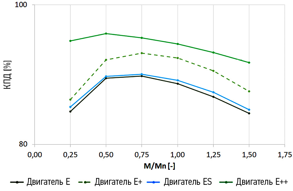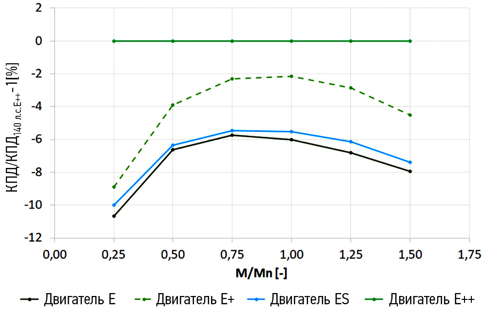 Рис. 2. На рисунке 2 показано относительное падение КПД двигателей E+, ES и E по сравнению с E++.