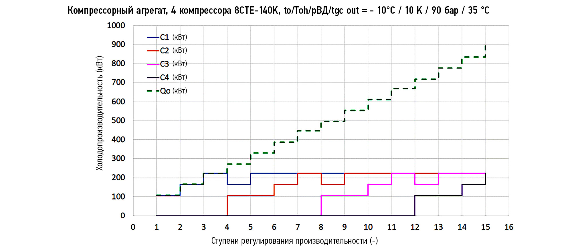 В Руководстве Ассоциации европейских производителей компонентов холодильного оборудования (ASERCOM) по проектированию многокомпрессорных агрегатов с использованием преобразователей частоты используется метод оценки уровня управления путем введения так называемого коэффициента регулирования (CF). Новое поколение компрессоров для промышленного применения может управляться с помощью частотно-регулируемого привода. В этом случае включаются все четыре блока цилиндров. Напротив, простой и эффективной альтернативой является механическая регулировка производительности. Электромагнитные клапаны, расположенные на головках блока цилиндров, управляют внутренними компонентами узла и обеспечивают работу соответствующего блока цилиндров на холостом ходу без сжатия газа. Механический принцип работы аналогичен тому, который был представлен компанией BITZER для компрессоров с четырьмя и шестью цилиндрами для транскритических установок на базе CO2. Однако, отличие кроется в способе управления. При управлении контроллером регулирование производительности не является квазибесступенчатым. Компрессоры имеют возможность механического запуска без нагрузки. При использовании двигателей, подключенных по схеме «звезда/треугольник» или устройств плавного пуска можно применять наиболее эффективные меры по снижению пускового тока. После пусковой фазы производительность можно регулировать ступенчато в диапазоне 50, 75 и 100% от номинала. В следующем примере рассматривается компрессорный агрегат с четырьмя компрессорами 8CTE-140K при вышеуказанных номинальных условиях. На рисунке 4 показан диапазон от минимальной производительности 107 кВт до максимальной 892 кВт.