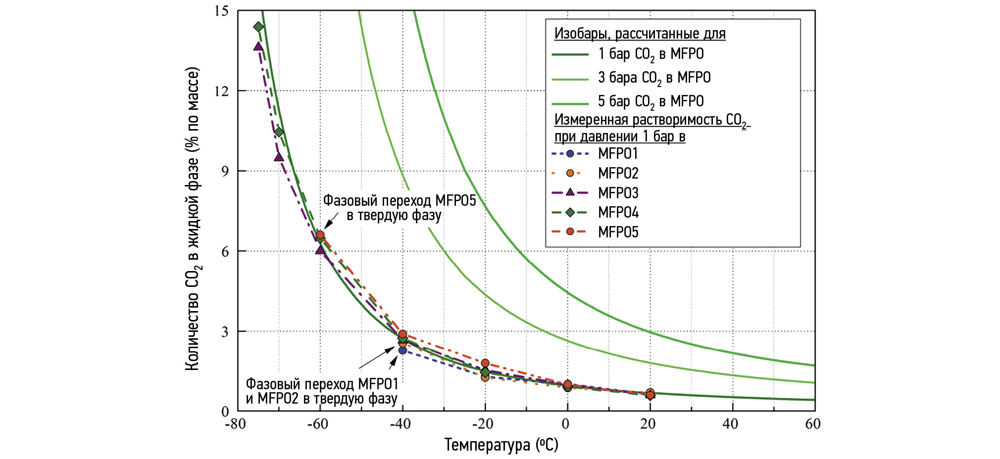 Газорастворимость СО2 в сложных эфирах исследовали двумя независимыми методами. Первый из них – это метод, в котором газообразный CO2 был растворен при давлении 1 бар (абс.) в сложных эфирах при различных температурах от +20 °C до -75 °C. Исследования проводились в автоклаве. При достижении равновесия растворимости в автоклаве (постоянное давление) автоклав закрывали и гравиметрически определяли растворенный CO2. Результаты этого метода вместе с интерполированными кривыми (основанными на значениях давления пара) для эфира MFPO4 при 1, 3 и 5 бар показаны на рис. 1. MFPO означает зашифрованный синоним соответствующего эфира. Точные названия эфиров в данной публикации не приводятся из соображений конфиденциальности.