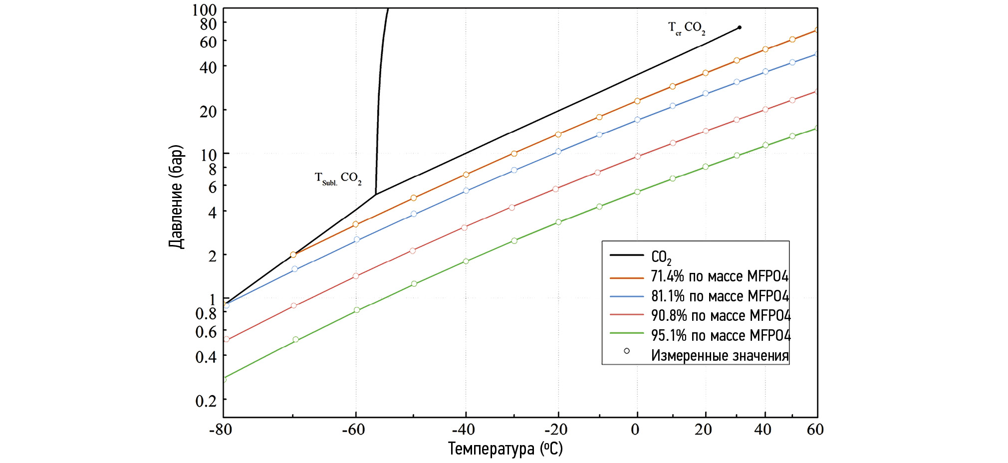 Второй метод заключается в измерении давления пара предварительно перемешанных смесей CO2-эфиров с различной концентрацией. Смеси СО2-эфиров помещали в автоклав (объем ~0,5 л) для определения давления паров. Необходимое количество веществ взвешивали гравиметрически. Для быстрого установления фазового равновесия оба компонента смеси перемешивали в автоклаве с помощью магнитной мешалки. Температура в автоклаве регулировалась с помощью термостатической ванны. Температура в автоклаве измерялась с помощью калиброванного датчика Pt100. Для измерения кривой «давление-температура» каждую смесь, примерно по четыре образца, уравновешивали при нескольких постоянных температурах. На рис. 2 показан сложный эфир MFPO4, который был выбран для всех дальнейших исследований из-за его сравнительно наиболее выгодных свойств.