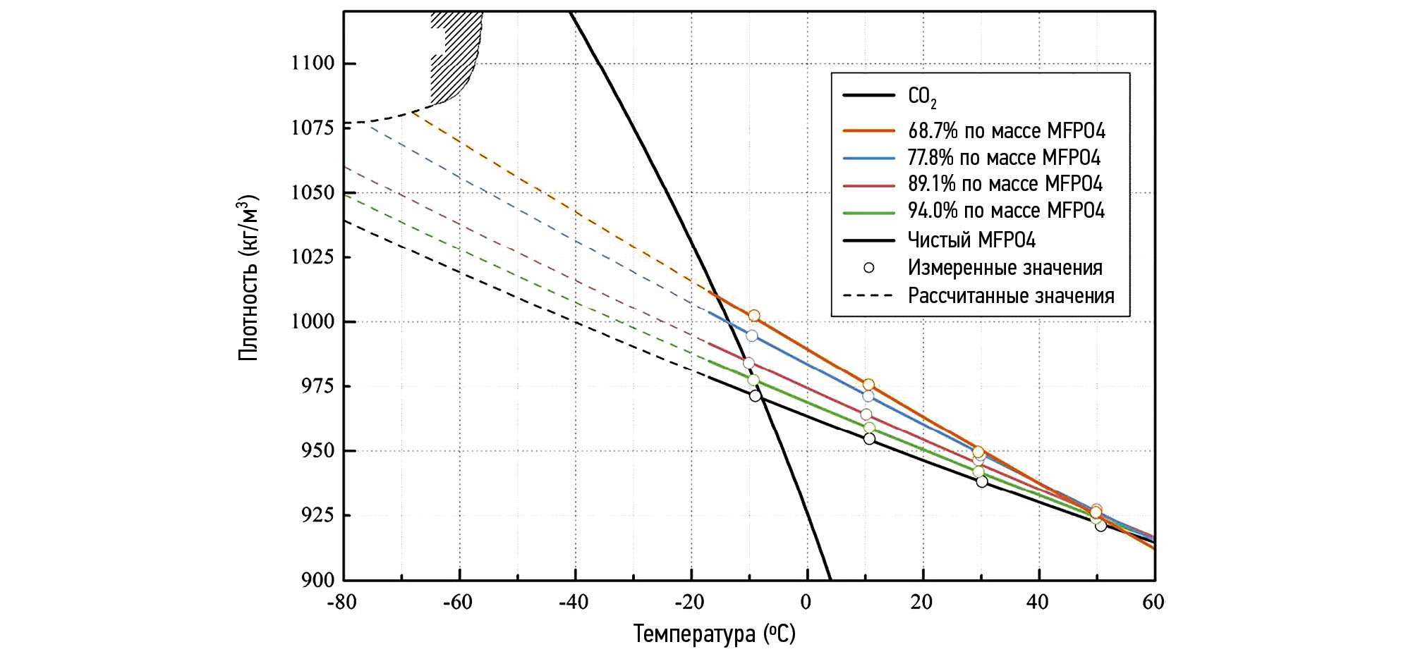 Плотность чистых эфиров и их смесей с СО2 измеряли с помощью измерительной ячейки DMA HPM производства компании Anton Paar Germany GmbH. Принципы измерения с помощью этого прибора подробно описаны в работе Feja et al. [3]. Погрешность измерения плотности составляет менее 0,5%. На рисунке 3 представлены результаты экспериментов для смесей СО2-эфиров-MFPO4 в диапазоне температур от -10 °С до +50 °С. Диапазон от -10 °C до -80 °C экстраполируется на основе измеренных данных. Экстраполированные кривые заканчиваются на границе смешиваемости в зависимости от концентрации CO2 в смесях.