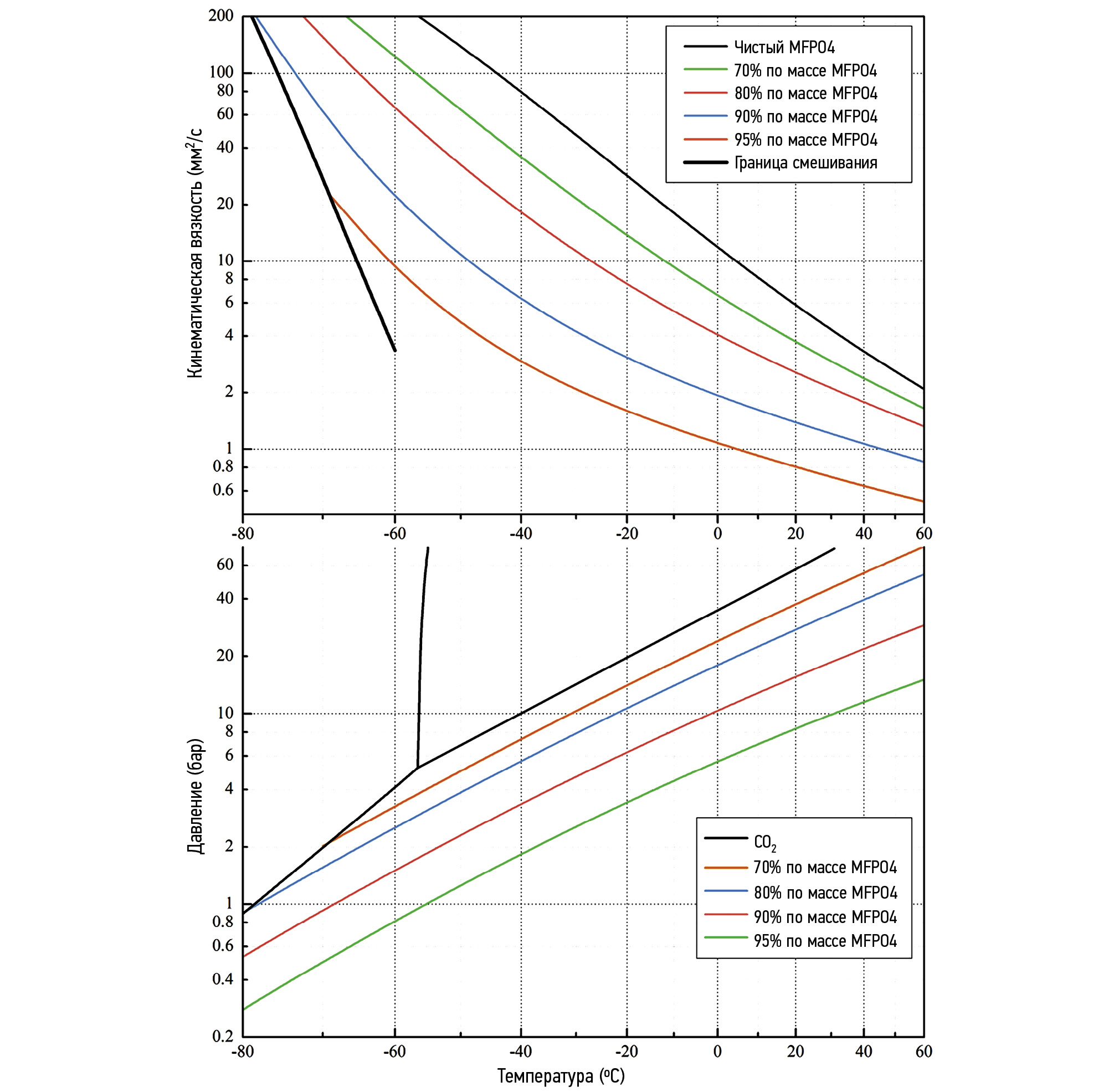Если сравнивать со стандартной холодильной системой на базе полиоловых эфиров и CO2, то разрушающая нагрузка при избыточном давлении смеси MFPO4 — CO2 выше. Коэффициент трения выше по сравнению со стандартными смазочными материалами. Трибологические исследования с другими низкомолекулярными эфирами подтверждают эти тенденции.