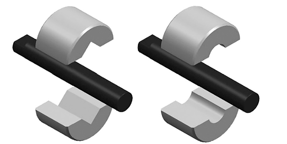 Рис. 5. Полуподшипники с геометрией Falex (слева) и полуподшипники Almen-Wieland (справа) и контрольный штифт.