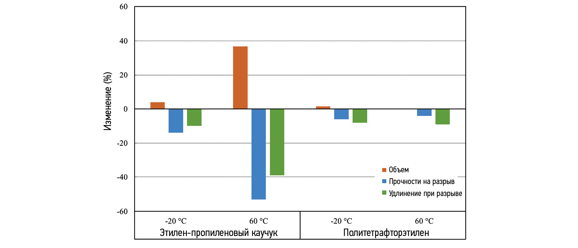 Изменение свойств этилен-пропиленового каучука было более выражено после старения при 60 °C по сравнению со старением при -20 °C. Как правило, увеличение объема до 10% и снижение прочности на разрыв или удлинение при разрыве на 50% считаются допустимыми пределами. При -20 °C этилен-пропиленовый каучук удовлетворяет этим требованиям, при 60 °C материал разрушается. Необходимо найти более подходящий уплотнительный материал.