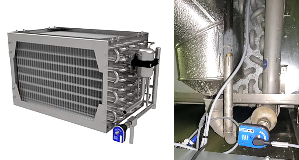 Функция: Датчик паросодержания, расположенный на выходе из испарителя, может быть настроен на контроль слива конденсата во время оттайки и действовать как поплавковый клапан в сочетании с электромагнитным клапаном, расположенным в линии возврата конденсата.