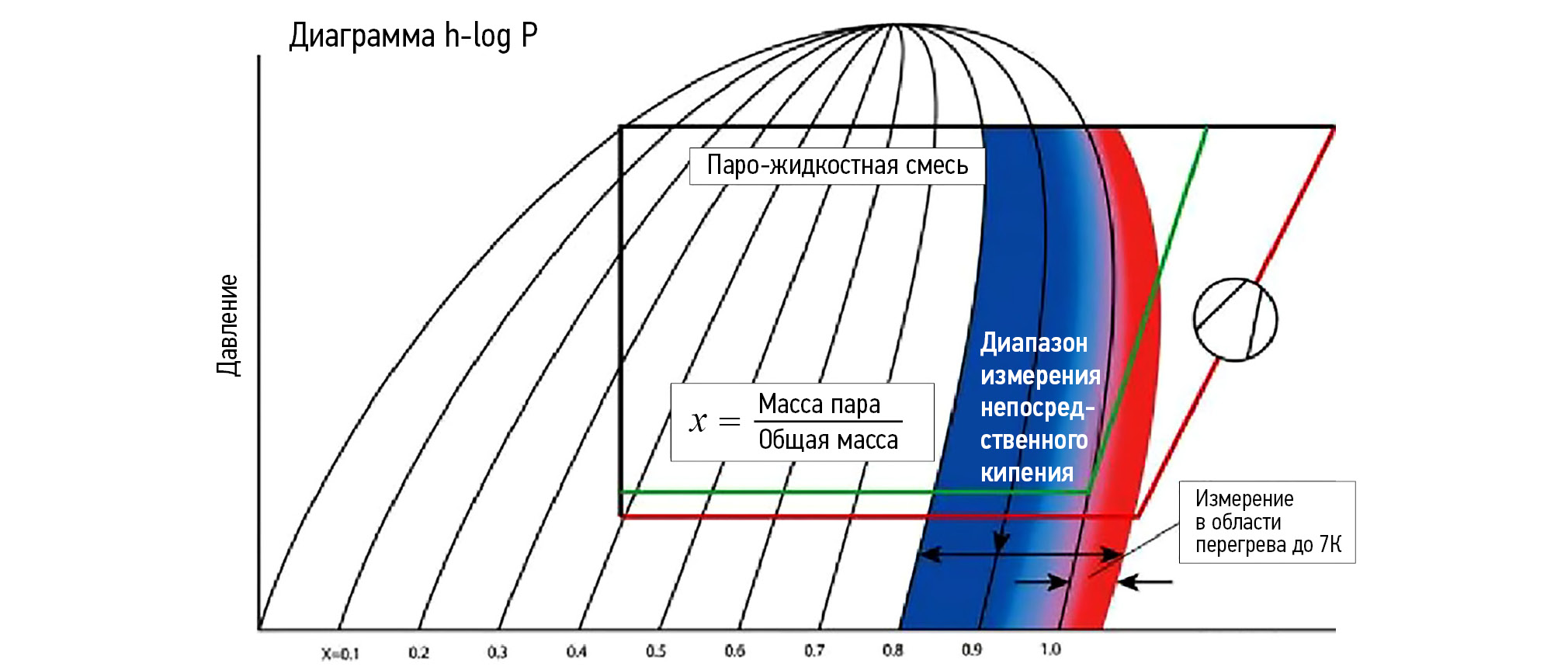 Рис. 4. Диапазоны измерений непосредственного кипения показаны на диаграмме h-log P.