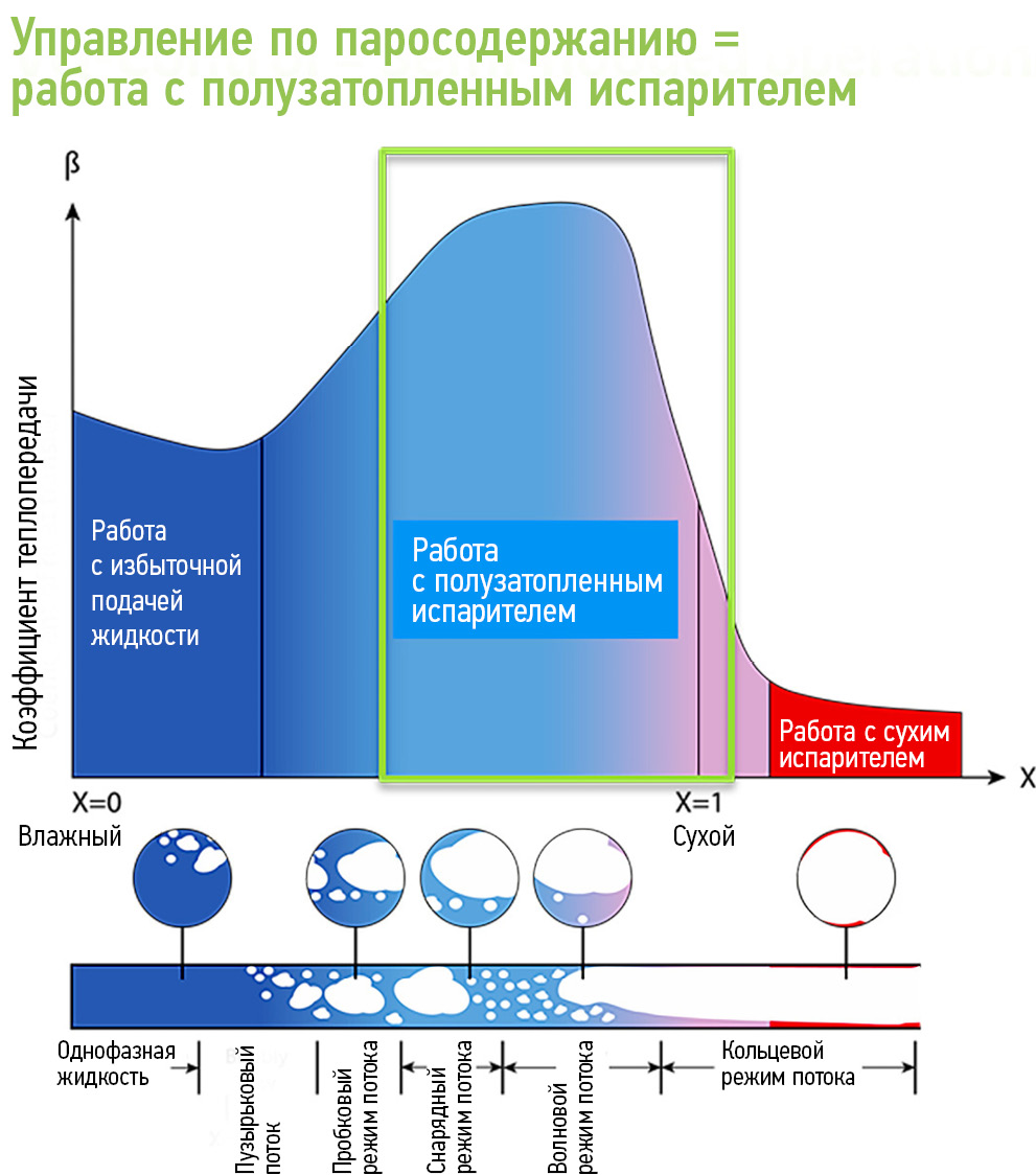 В системе с избыточной подачей жидкости с затопленными испарителями хладагент не выкипает полностью. Слишком большое количество хладагента будет ограничивать кипение, так как кипение происходит в виде пузырькового и пробкового потока, характеризующегося более низкими значениями коэффициентов теплопередачи по сравнению с коэффициентом теплопередачи, который может быть достигнут при кипящем потоке в полузатопленных испарителях (см. рис. 5).