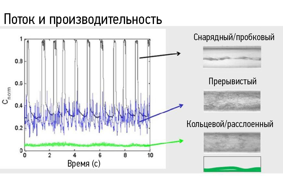 На рис. 6 показано соотношение расхода и производительности для различных характеров потока. (Измерения проведены Гентским университетом в Бельгии). В случае двухфазных потоков диэлектрическая проницаемость обеих фаз сильно влияет на измеряемую емкость [4].
