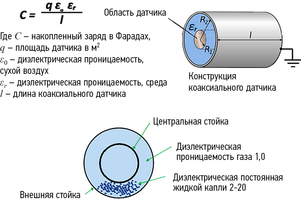 В основе принципа действия датчика лежит принцип измерения емкости, когда два или более измерительных электрода/проводника измеряют паросодержание как изменение электрического поля/сопротивления в зависимости от разницы в диэлектрических свойствах, называемых «диэлектрической проницаемостью» в зависимости от соотношения между паром и жидкостью (см. рис. 7). Измерение происходит мгновенно, т.е. без задержек.