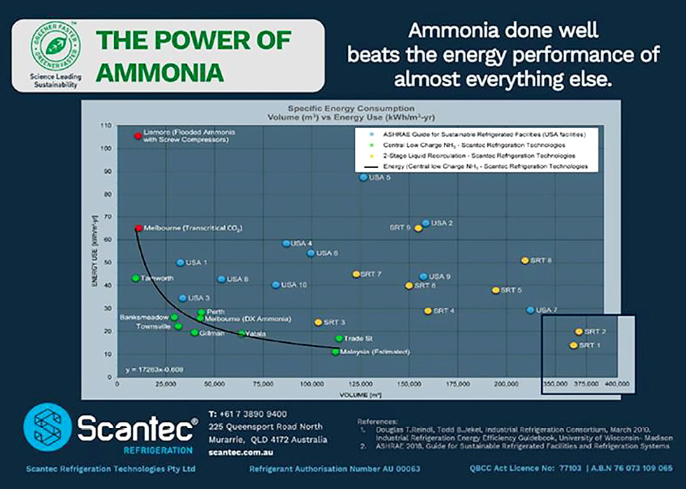 - Зеленая точка — современные двухступенчатые аммиачные холодильные установки с малой заправкой (Scantec, Австралия).