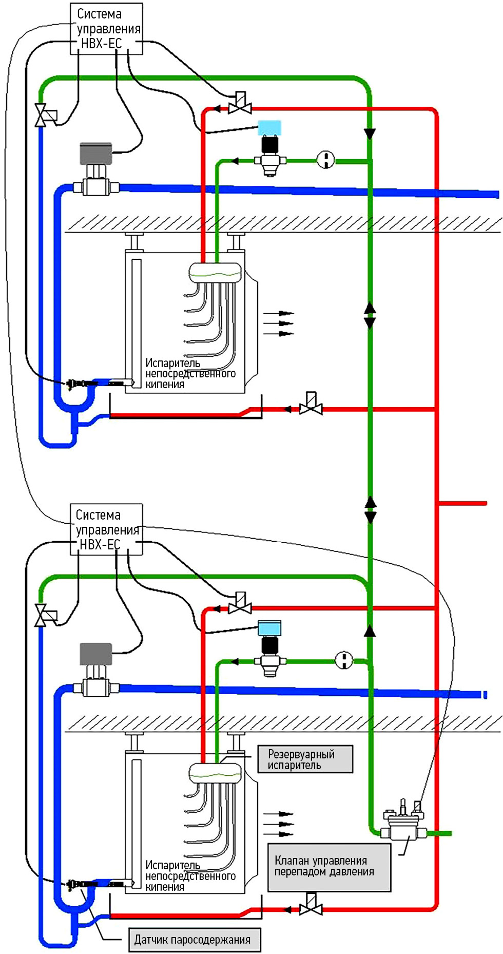 Примечание: Опыт эксплуатации аммиачных установок непосредственного кипения с малой заправкой с винтовыми компрессорами в Германии и Румынии показывает сопоставимые данные по безопасной эксплуатации и значительной экономии энергии, достигнутой благодаря использованию контроля паросодержания в сочетании с алюминиевыми испарителями непосредственного кипения.