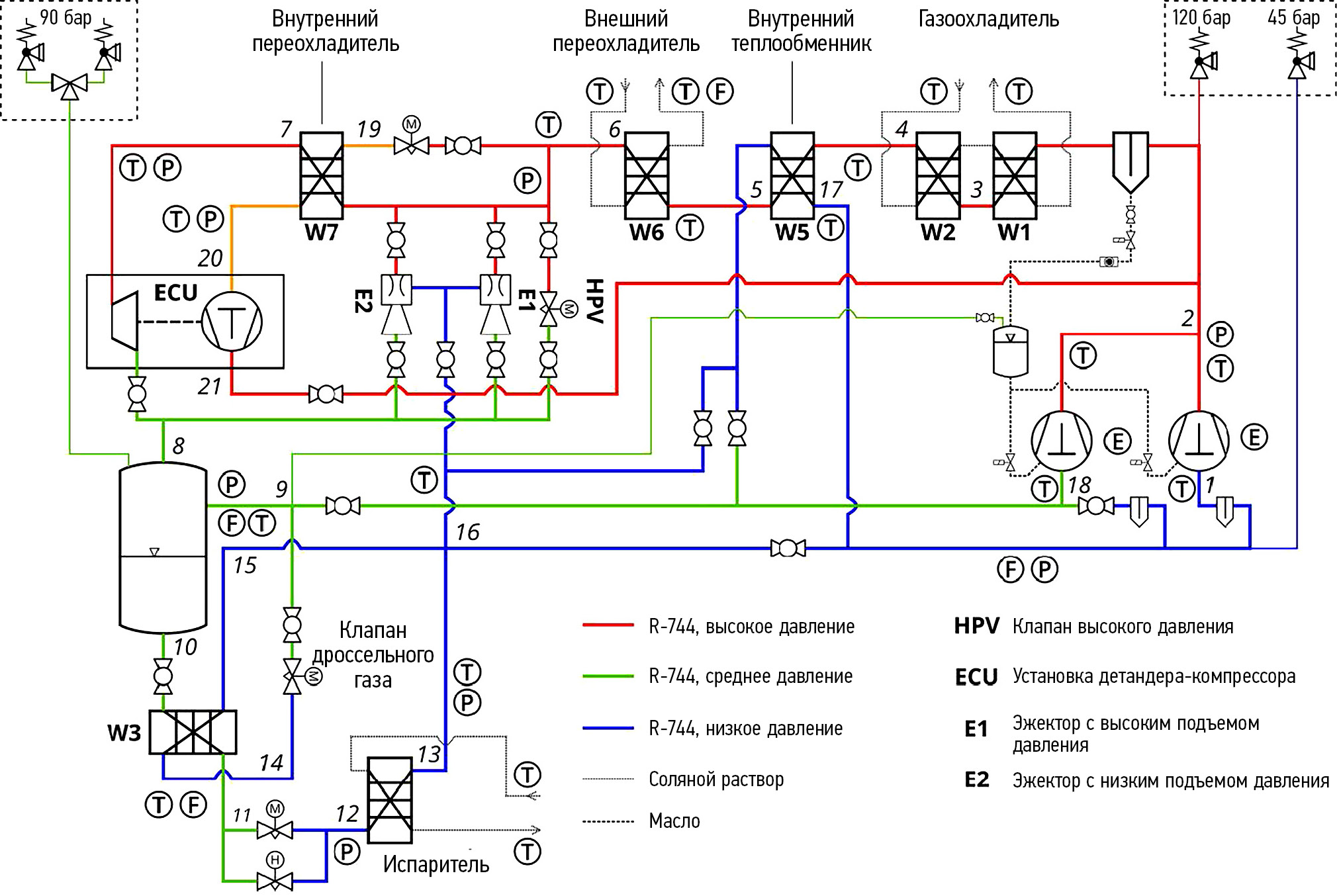 Номинальный объемный расход параллельного компрессора составляет 3,3 м3/ч. Все теплообменники выполнены в виде пластинчатых теплообменников. Вторичной жидкостью для газоохладителя/конденсатора (в дальнейшем именуемого просто газоохладителем) и испарителя является соляной раствор, а вторичной жидкостью для внешнего переохладителя является вода. В системе предусмотрено четыре варианта расширения CO₂ от высокого давления до среднего: клапан высокого давления для базовой системы, два различных типа эжекторов, один из которых оптимизирован для высокого подъема давления с низким коэффициентом эжекции, а другой - для низкого подъема давления с высоким коэффициентом эжекции, и, наконец, блок детандера-компрессора для приведения в действие внутреннего цикла переохлаждения (экономайзер). Образующийся дроссельный газ отделяется в сосуде среднего давления и может быть либо дросселирован до низкого давления с помощью клапана дроссельного газа, либо сжат до высокого давления параллельным компрессором. Жидкий хладагент дросселируется и затем кипит в испарителе. При необходимости во внутреннем теплообменнике может создаваться перегрев. Давление и температура измеряются в каждой соответствующей точке цикла, как и потребление электроэнергии преобразователями частоты компрессоров.