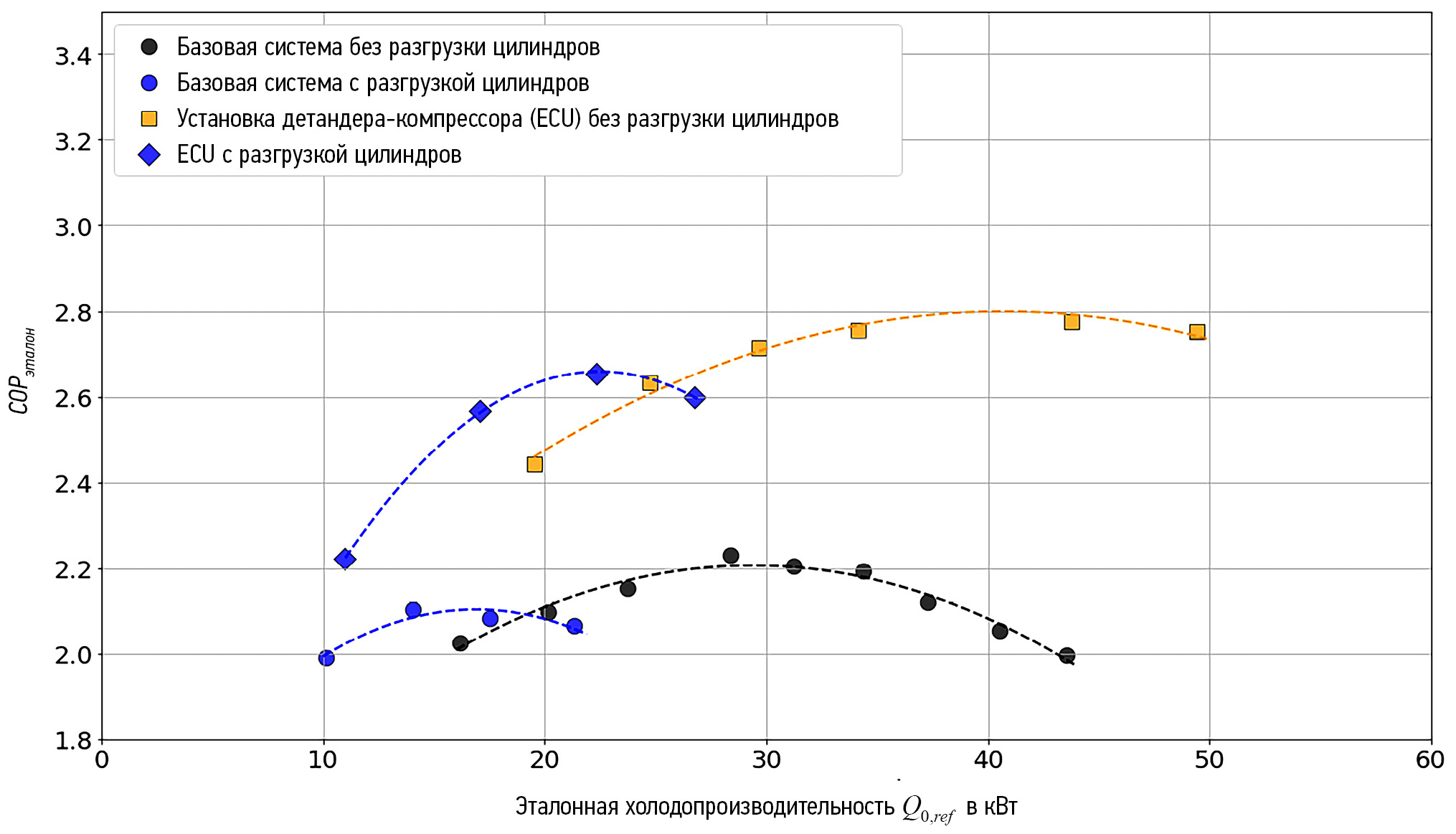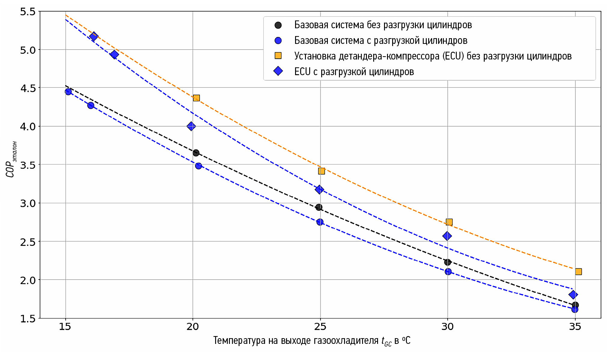 Рис. 2. Эффективность (эталонный COP) базовой системы и системы с экономайзером ECU с разгрузкой цилиндров и без нее при различных температурах на выходе из газоохладителя.
