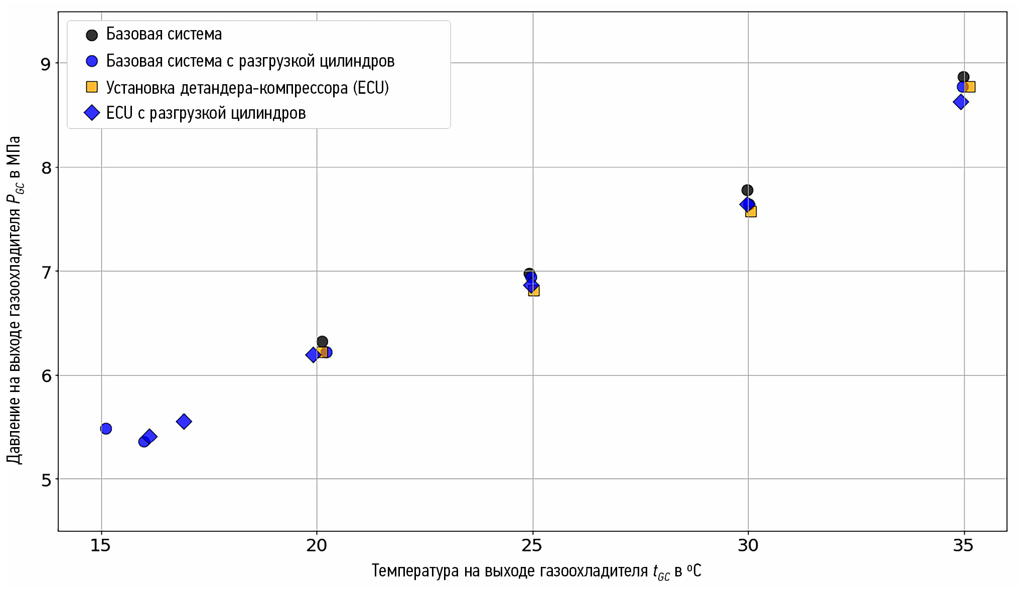 При снижении температуры на выходе из газоохладителя COP системы повышается за счет уменьшения работы по сжатию и увеличения холодопроизводительности. При использовании компрессорно-детандерного цикла с экономайзером COP повышается примерно на 20%. При низких температурах на выходе из газоохладителя это повышение эффективности наиболее значительно, тогда как при более высоких температурах на выходе из газоохладителя работа системы с частичной нагрузкой за счет разгрузки цилиндров приводит к снижению эффективности как компрессора, так и установки детандера-компрессора. Вследствие ограничений по отводу теплоты в системе, было невозможно провести измерения без разгрузки цилиндров при температуре на выходе из газоохладителя ниже 20°C. При использовании разгрузки цилиндров массовый расход хладагента и, следовательно, отводимый тепловой поток уменьшаются. Соответственно, можно снизить давление и температуру на выходе газоохладителя и проводить измерения при более низкой температуре на выходе. Измерения, проведенные при температуре на выходе из газоохладителя 15°C, отличаются несколько более высоким давлением и большей разницей температур переохлаждения по сравнению с измерениями при 16°C, что также является результатом ограниченной теплопередачи в газоохладителе. Это оказывает незначительное влияние на КС. Самый высокий COP был измерен при самой низкой температуре на выходе из газоохладителя, которая составляет 15°C для базовой системы и 16°C для системы ECU. Измерения параметров систем с разгрузкой цилиндров показывают несколько меньший COP без использования такой разгрузки как для базовой системы, так и для системы с ECU. Потери эффективности в базовом цикле происходят главным образом в компрессоре, что означает, что работа с частичной нагрузкой влияет на эффективность компрессора и системы.