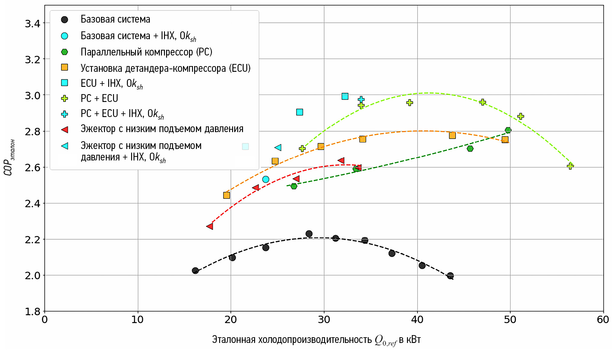 Рис. 5. Эталонный COP при различной холодопроизводительности для различных конструкций систем при температуре на выходе из газоохладителя 30°C и давлении 7,5 МПа.