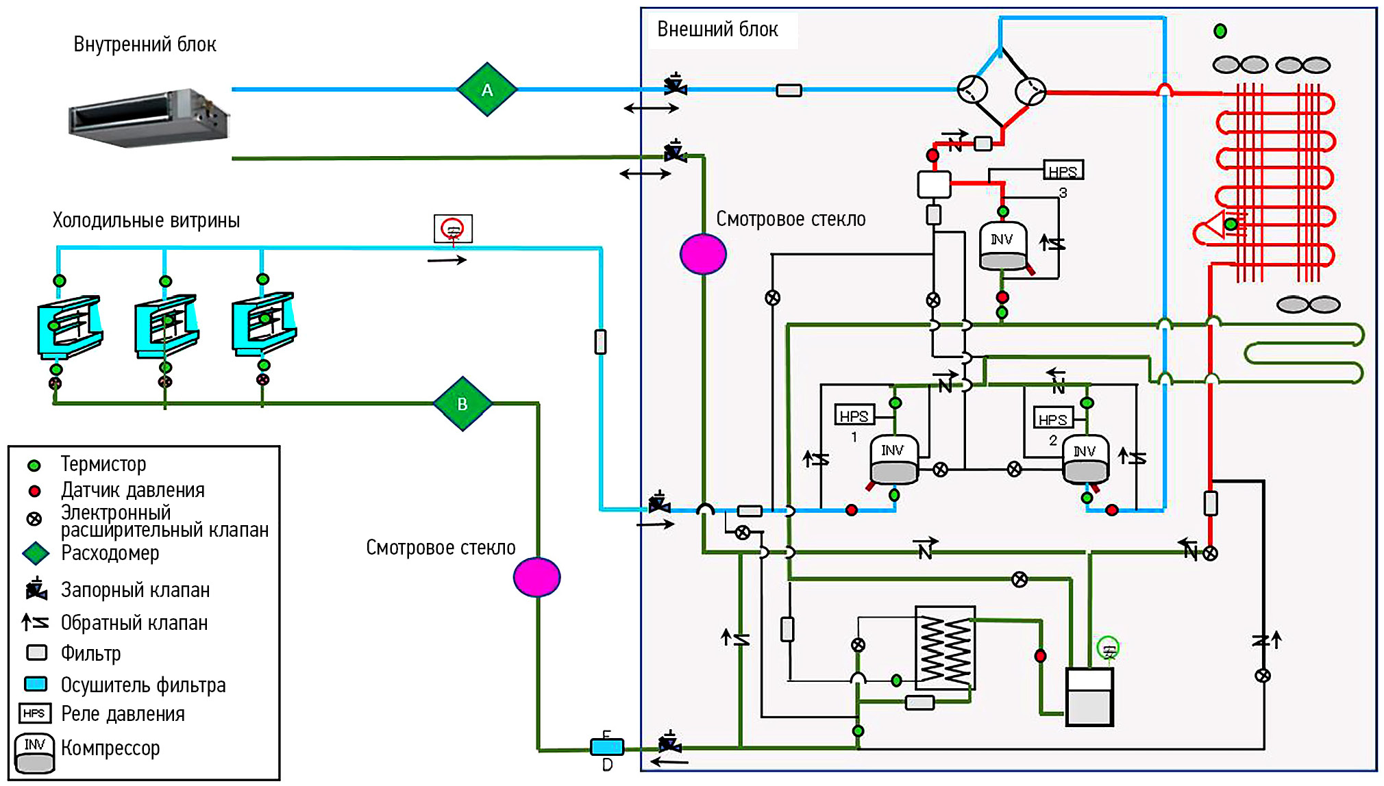 Установка CO₂ Conveni-pack компании Daikin представляет собой комбинированную холодильную систему и систему кондиционирования воздуха, использующую CO₂ в качестве хладагента, изображенную на рис. 1. Система способна обеспечивать одновременное холодоснабжение и обогрев или охлаждение помещений за счет использования двух независимых компрессоров низкой ступени, работающих в паре с одним компрессором второй ступени.