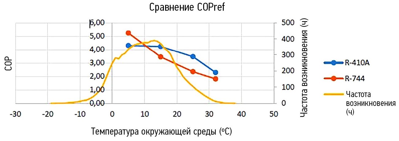 На рис. 2 представлены частоты возникновения и COPref для каждой системы в зависимости от температуры бункера. Из этого графика видно, что хотя система на основе ГФУ показывает более высокий коэффициент преобразования при любой температуре выше 10℃, появление более низких температур сводит на нет это преимущество, где система на основе CO₂ показывает значительно более высокий COPref.