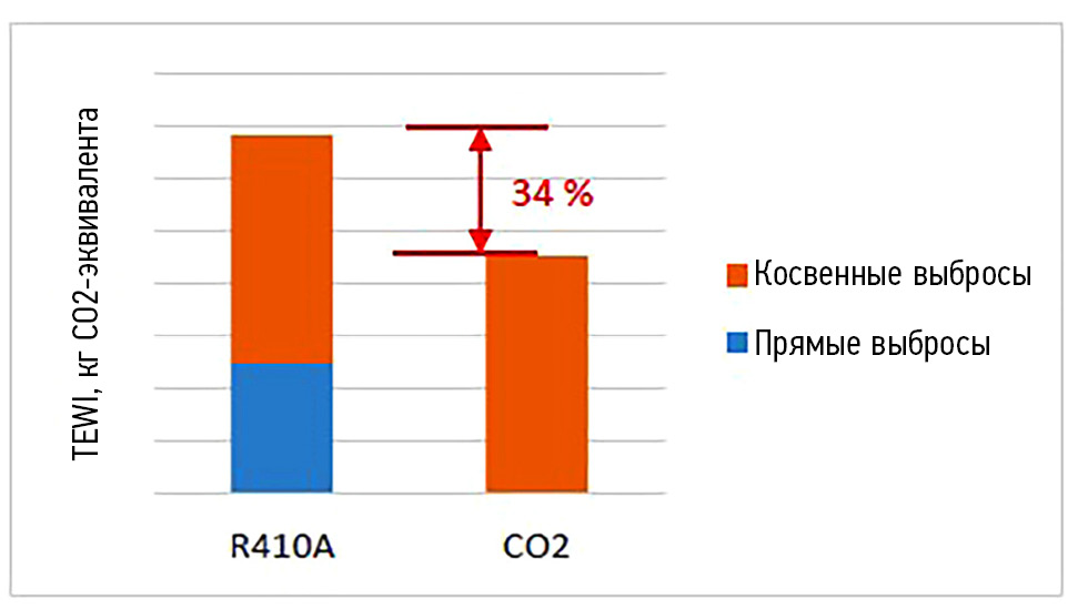 Исходя из условий бункера и точек состояния, SEPR системы на R410A был рассчитан как 4,05, в то время как SEPR системы на R744 был рассчитан как 3,70. На основе годового потребления энергии, рассчитанного для каждой системы, был рассчитан показатель TEWI за 10-летний период. Даже при более низком эталонном COP можно заметить, что TEWI в течение срока службы системы на базе CO₂ примерно на 34% ниже, чем у системы на базе R410A, как видно из рис. 5.