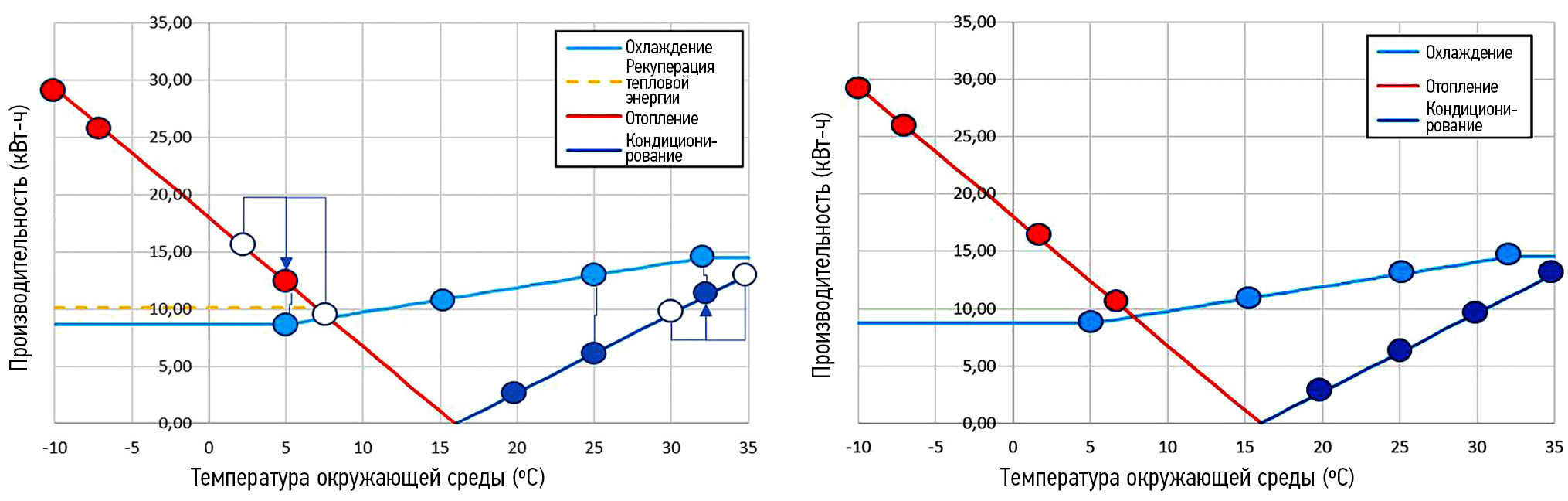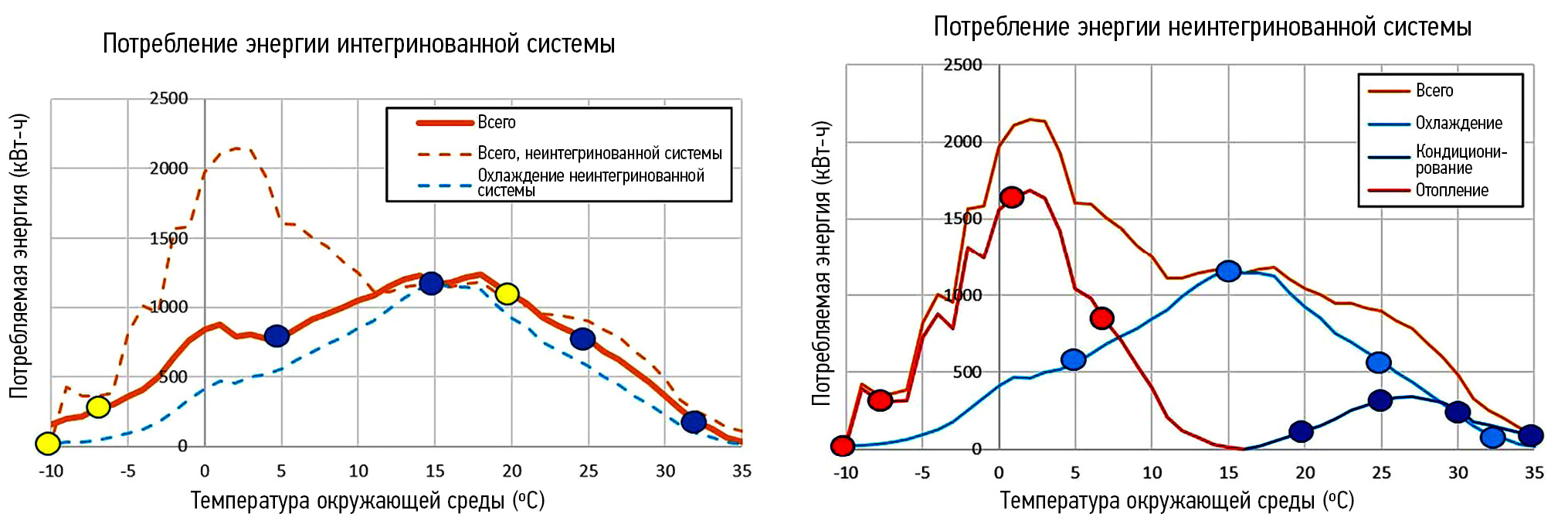 Риc. 5. Производительность охлаждения, отопления и кондиционирования для интегрированных (слева) и неинтегрированных (справа) систем.