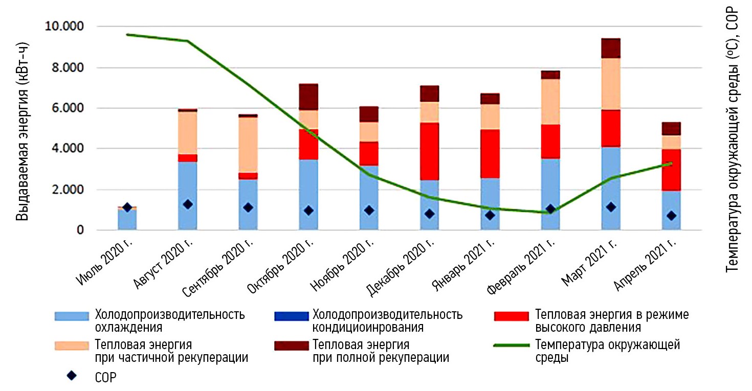 На рис. 7, 8 показаны энергетические показатели, а также температура окружающей среды за последние 4 месяца. Холодопроизводительность для охлаждения, холодопроизводительность кондиционирования и теплопроизводительность, классифицированные как полностью рекуперированные, частично рекуперированные или в режиме теплового насоса, складываются в гистограмму по месяцам. Как и ожидалось, с понижением температуры окружающей среды наблюдалось увеличение потребляемой тепловой энергии. Увеличение количества тепловой энергии, поставляемой с помощью теплового насоса в октябре и марте по сравнению с августом и сентябрем, показывает, что потребность в отоплении можно покрыть, если рекуперированного тепла от холодильных шкафов недостаточно. Коэффициент COP колебался в пределах от 1,8 до 3,1.