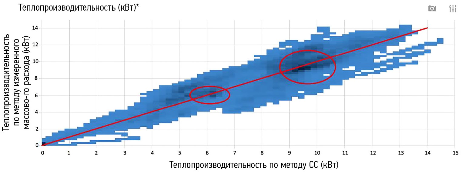 Из графика на рис. 9, сравнивающего тепловые мощности, рассчитанные двумя методами, видны два участка, обведенные красным, с большим количеством точек данных. На одном участке мощность, рассчитанная с использованием обоих методов, приблизительно равна 9,5 кВт. Другой участок, но с несколько меньшей частотой возникновения, показывает мощность около 6 кВт при использовании обоих методов. Таким образом, из графиков на рис. 9 и 10, как для отопления, так и для охлаждения, соответственно, видно, что метод CC хорошо согласуется с измеренными значениями и может быть улучшен путем дальнейшей калибровки.
