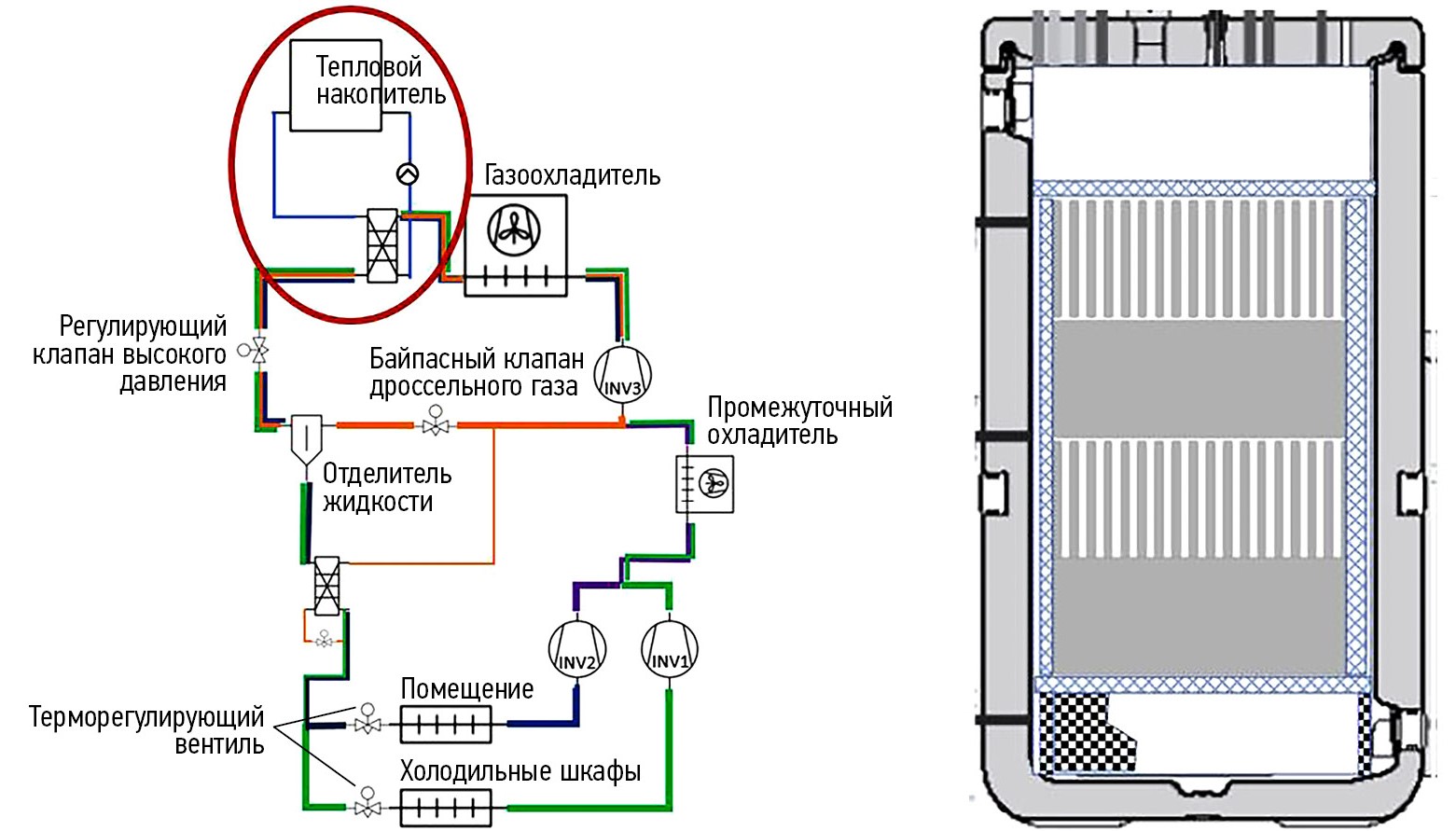 Как видно из приведенных выше сложностей, важными технологическими барьерами в системах CO₂ являются транскритические режимы работы при высоких температурах окружающей среды. Поэтому изучаются способы избежать или ограничить работу в транскритическом режиме, и одной из наиболее привлекательных концепций является использование теплового накопителя для накопления «холода» в ночное время, когда температура окружающей среды ниже. Для хранения тепловой энергии будет использоваться резервуар для воды с PCM, т.е. материалом, меняющим фазу, с температурой плавления 20℃. Вода из этого накопителя будет использоваться в течение дня для охлаждения хладагента, выходящего из газоохладителя, а не окружающей среды с высокой температурой, а в подходящих условиях для охлаждения PCM будет использоваться нагревательный цикл установки. На рис. 11 слева представлена схема блока с тепловым накопителем, а справа — конструкция бака для хранения воды с пластинами PCM внутри.