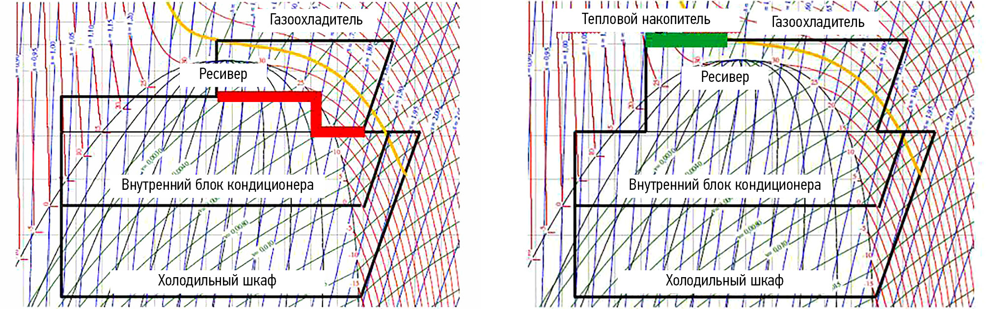 Из рис. 12 видно, что при добавлении теплового накопителя после газового охладителя, поскольку хладагент поступает в ресивер гораздо холоднее, чем в обычной системе, через холодильные шкафы или внутренние блоки может проходить больший массовый поток жидкого хладагента, увеличивая производительность. Кроме того, преимуществом использования теплового накопителя является сохранение холодопроизводительности даже при высоких температурах окружающей среды, которые, как уже упоминалось, приводят к резкому снижению производительности.