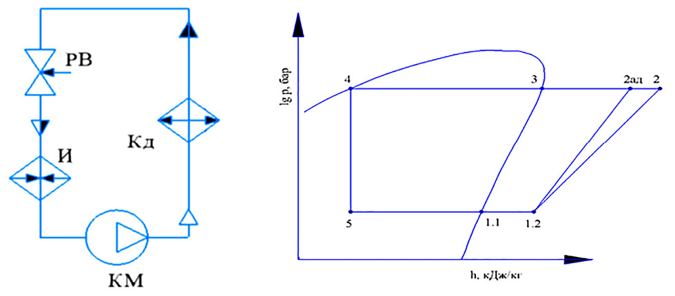 Рис. 2. Принципиальная схема цикла. КМ — компрессор, Кд — конденсатор, И — испаритель, РВ — регулирующий клапан.