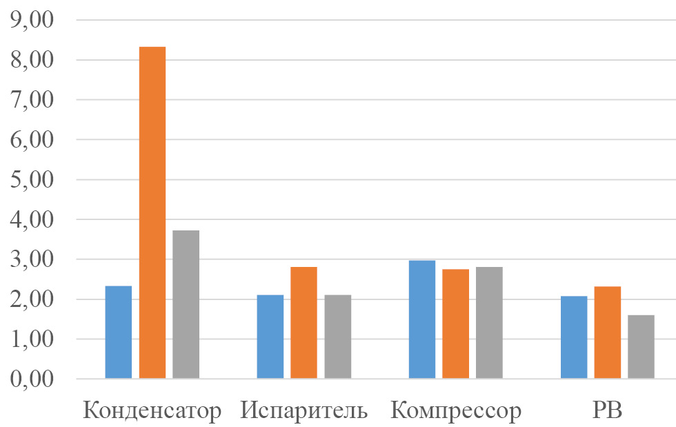 Однако, значение холодильного коэффициента отличались от указанных в техническом задании на 7,9%. На основании данных анализа, было обнаружено, что наибольшие энергетические потери имеют место быть в конденсаторе и испарителе.