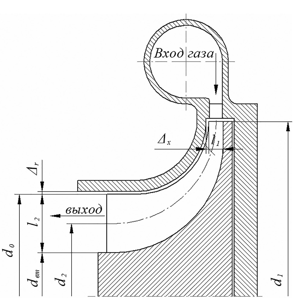 Рис. 1. Схема течения газа в проточной части радиально-осевой турбины: d1 – наружный диаметр колеса, d2 – средний диаметр колеса на выходе, d0 – диаметр воронки колеса, dвт – диаметр втулки колеса, l1, l2 – высота лопатки на входе и выходе из колеса, соответственно, Δx – величина осевого зазора, Δr – величина радиального зазора. / Fig. 1. Scheme of gas flow in the flow path of a radial-axial turbine: d1 – outer diameter of the impeller, d2 – average diameter of the impeller at the outlet, d0 – diameter of the impeller funnel, dвт – diameter of the impeller hub, l1 and l2 – blade height at the impeller inlet and outlet, respectively, Δx – axial clearance, Δr – radial clearance.