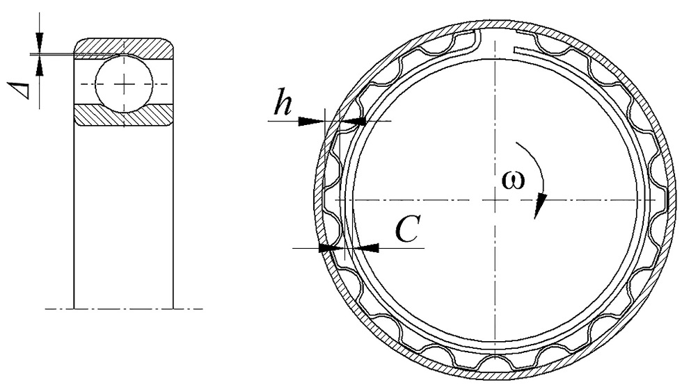 Рис. 2. Источники зазоров в шариковом подшипнике качения (a) и лепестковом газодинамическом подшипнике (b): Δ – радиальный зазор; C – монтажный зазор, h – высота гофров упругого демпфера. / Fig. 2. Sources of clearances in a ball bearing (a) and a petal-type gas-dynamic bearing (b): Δ – radial clearance; C – mounting clearance, h – height of the corrugations of the elastic damper.