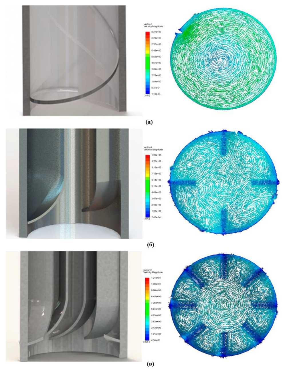 Рис. 5. Геометрия выпрямителей и поля скорости в характерном сечении: а – спиральная навивка; б – оребрение с «плавным входом» и шагом 90°; в – оребрение с «плавным входом» и шагом 45°