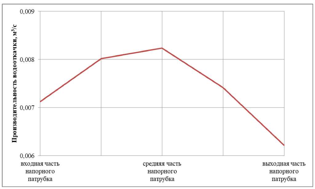 На основе предварительного варианта конструктивной реализации эжекционной системы водооткачки с одним рядом отверстий была выполнена серия симуляционных расчетов для определения влияния расположения ряда в напорном патрубке на производительность водооткачки, результаты которых представлены на рис. 3.