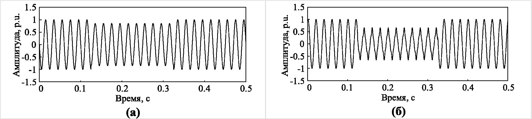 Рис. 10. Результаты обнаружения провала напряжения при наличии шума (а) и гармоник (б) предложенным методом\