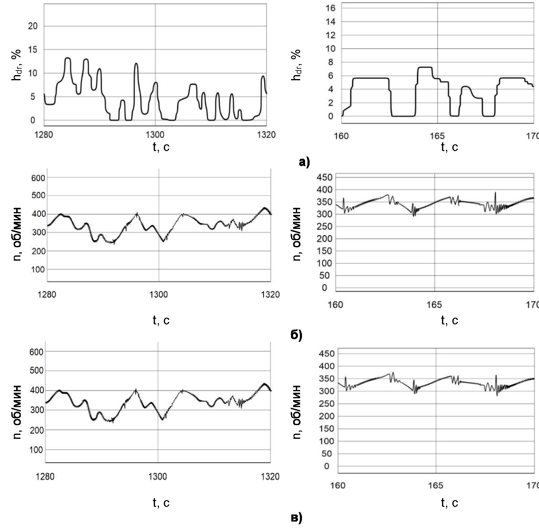 На рис. 4 отчетливо видны всплески на графиках угловых скоростей вращения роторов тяговых электродвигателей, свидетельствующие об ударной перекладке зубьев в механической передаче. Данные всплески реализаций могут в дальнейшем провоцировать автоколебания в механической трансмиссии, которым могут способствовать процессы в зоне контакта шины с дорогой [16-36], а также в электрической машине [37, 38] подавляемые в последствие с помощью управления электромеханическим приводом [39].