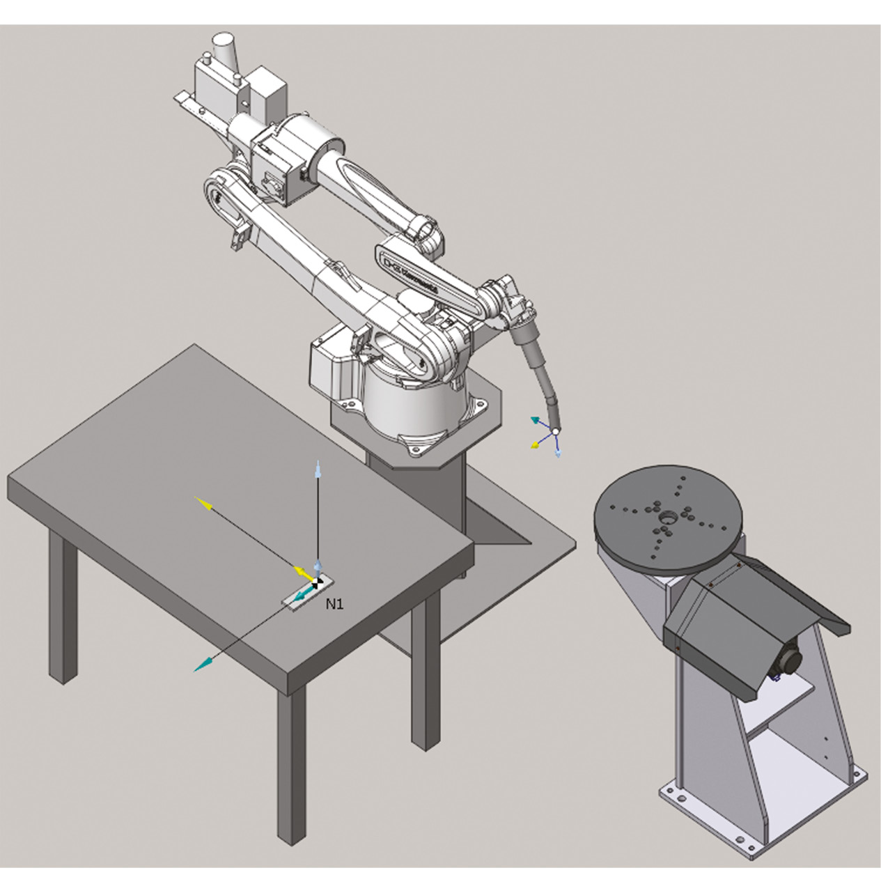 Импортированные компоненты были настроены: для позиционера и робота-манипулятора были заданы базовые точки, рабочие зоны, а также ограничения на углы отклонения осей и их угловые скорости. Эти параметры критически важны для предотвращения коллизий и обеспечения безопасности работы оборудования. Конечный вид цифрового двойника представлен на рис. 3.