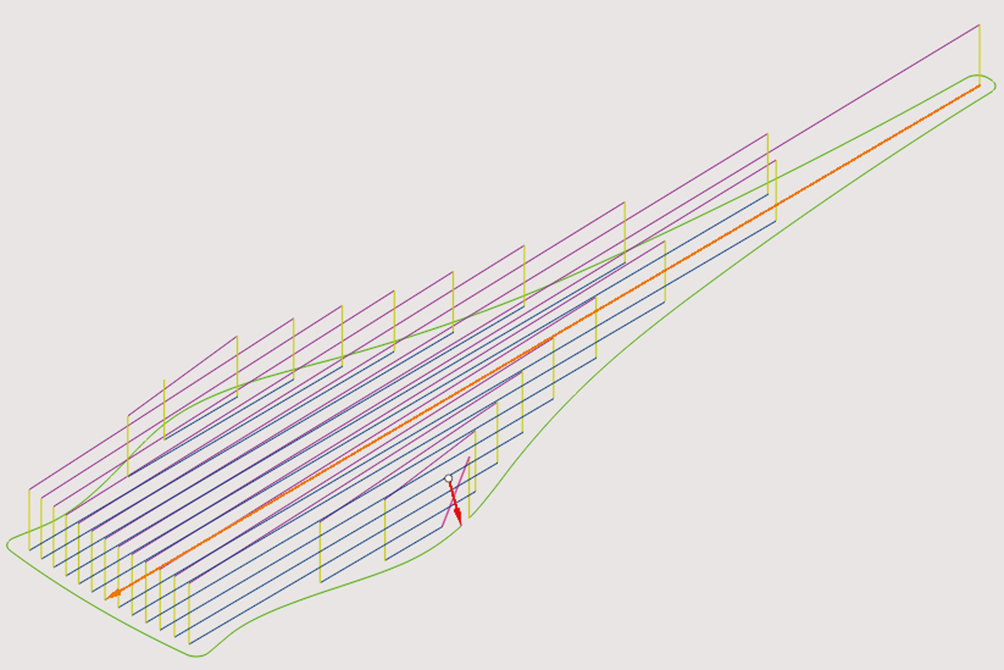 Рис. 4. Пример заполнения одного слоя. Зеленый цвет линий ― контур изделия, синий ― заполнение внутри контура, фиолетовый ― переходы между валиками, желтый ― подходы и отходы.