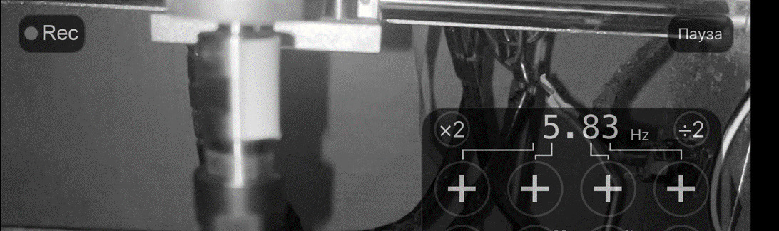 Во время эксперимента необходимо определение фактической частоты вращения вала в паре трения, установившейся в процессе эксперимента. Для выполнения данной задачи используется эффект стробоскопа, при совпадении частоты включений лампы или частоты кадров видеокамеры с частотой вращения вала, метка нанесенная на вращающейся вал «застывает». Окно программы с фиксацией частоты вращения вала придавлен на рис. 4.