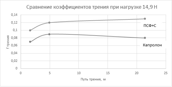 Исходя из результатов экскремента можно сделать вывод, для капролона при нагрузке 14,9Н в начале процесса трения наблюдается увеличение динамического коэффициента трения, после притирки коэффициент трения незначительно уменьшается. Динамический коэффициент трения для образца ПСФ+10%С больше порядка двух раз чем у капролона. В отличии от капролона, у ПСФ+10%С коэффициент трения увеличивается на всем рассматриваемом участке. Линейный износ для ПСФ+С на порядок больше, чем у капролона.