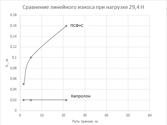 Капролон в данном эксперименте сохраняет постоянным значение линейного износа (максимальное значение, достигнутое при нагрузке 14,9Н.