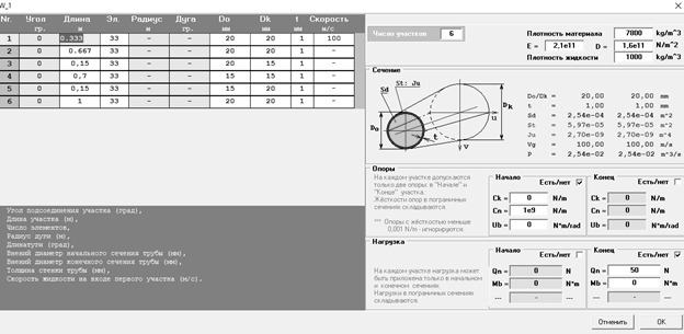 Все пять трубопроводов изготовлены из стали плотностью 7800 кг/м3 с модулем упругости 2,1·1011 Па, плотность протекающей жидкости 1000 кг/м3 для каждого трубопровода. Толщина всех трубопроводов равна 1 мм.