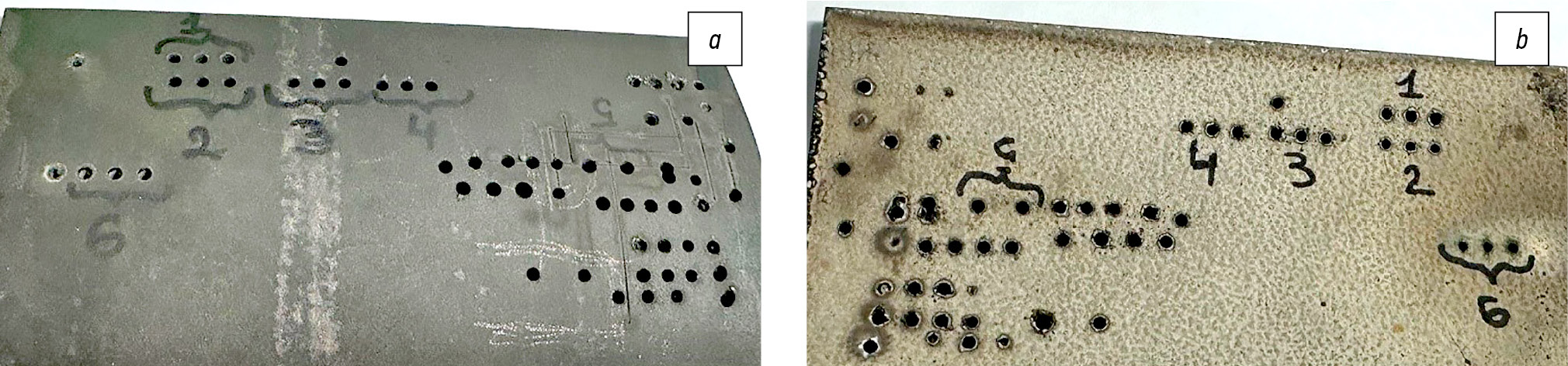 Рис. 6. Общий вид отверстий со стороны выхода лазерного излучения: а — образец, покрытый пастой; b — образец без пасты.
