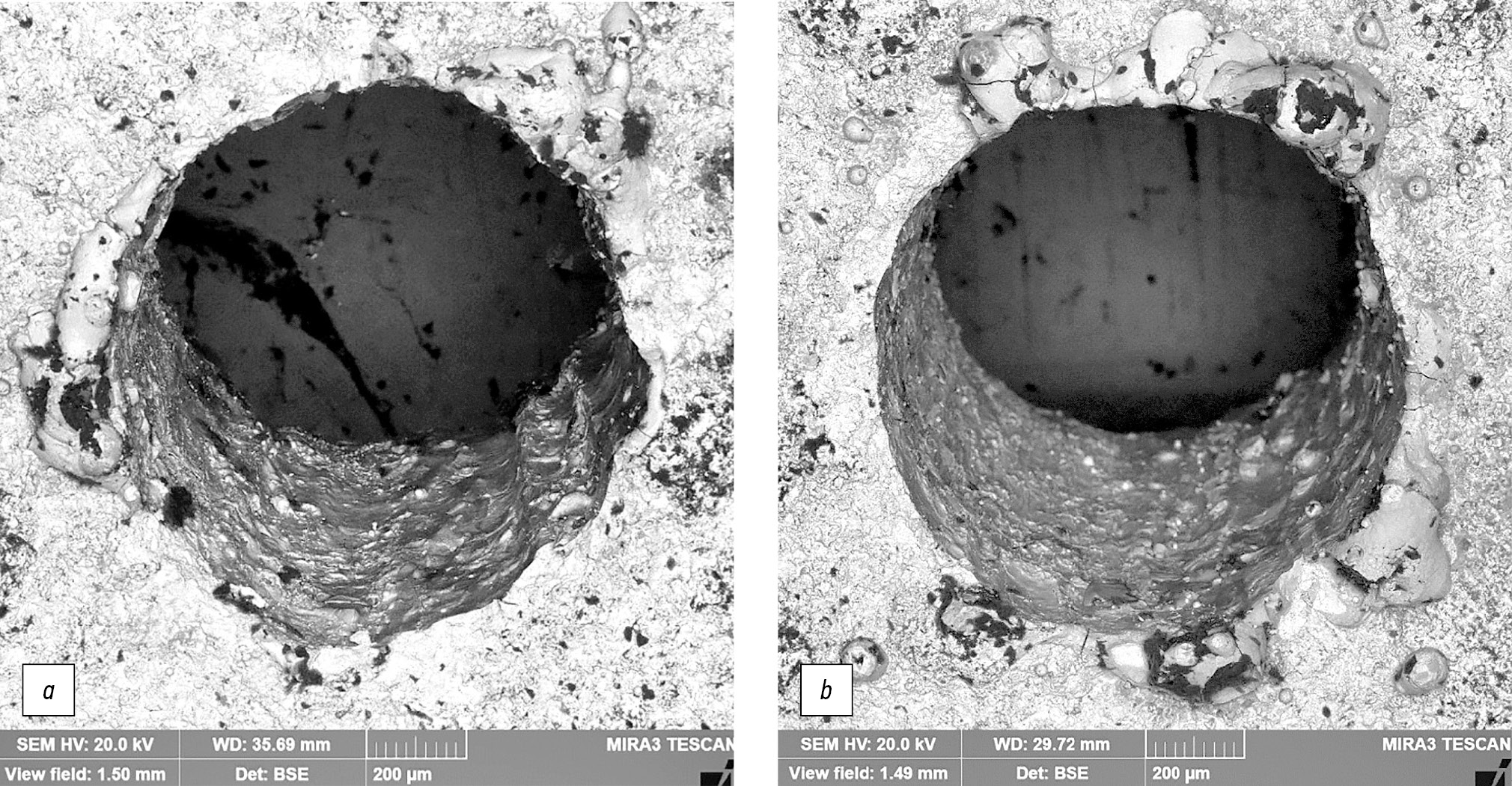 Рис. 8. Сравнение качества отверстий, просверленных под углом 40° к поверхности. Вид со стороны выхода лазерного излучения: а — образец, покрытый пастой; b — образец без пасты.
