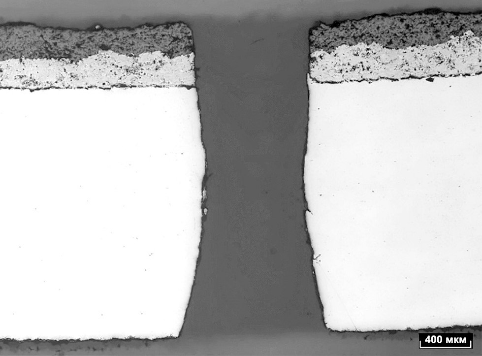 При подготовке образцов соблюдалась особая осторожность, поскольку термозащитное покрытие очень хрупкое. Образец зажимался таким образом, чтобы режущий диск проходил сначала через термозащитное покрытие, для минимизации его повреждений. Затем образцы запрессовывались в бакелит, после чего шлифовались с последовательным уменьшением зернистости шлифовальной бумаги и финишной полировкой алмазной пастой. Чтобы выявить измененный слой, образцы были протравлены.