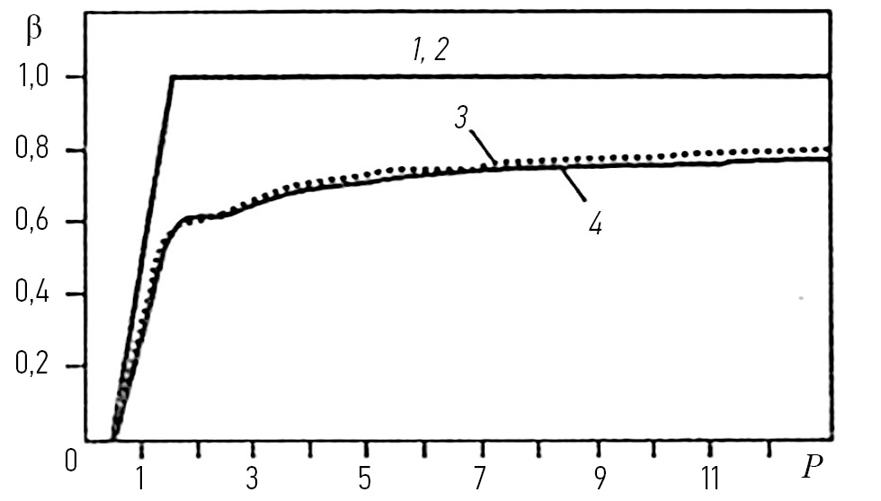 На рис. 2 приведены зависимости вероятности правильного обнаружения β = f (P) при адаптивном пороге обнаружения (кривые 1, 2) и неадаптивном (кривые 3, 4).